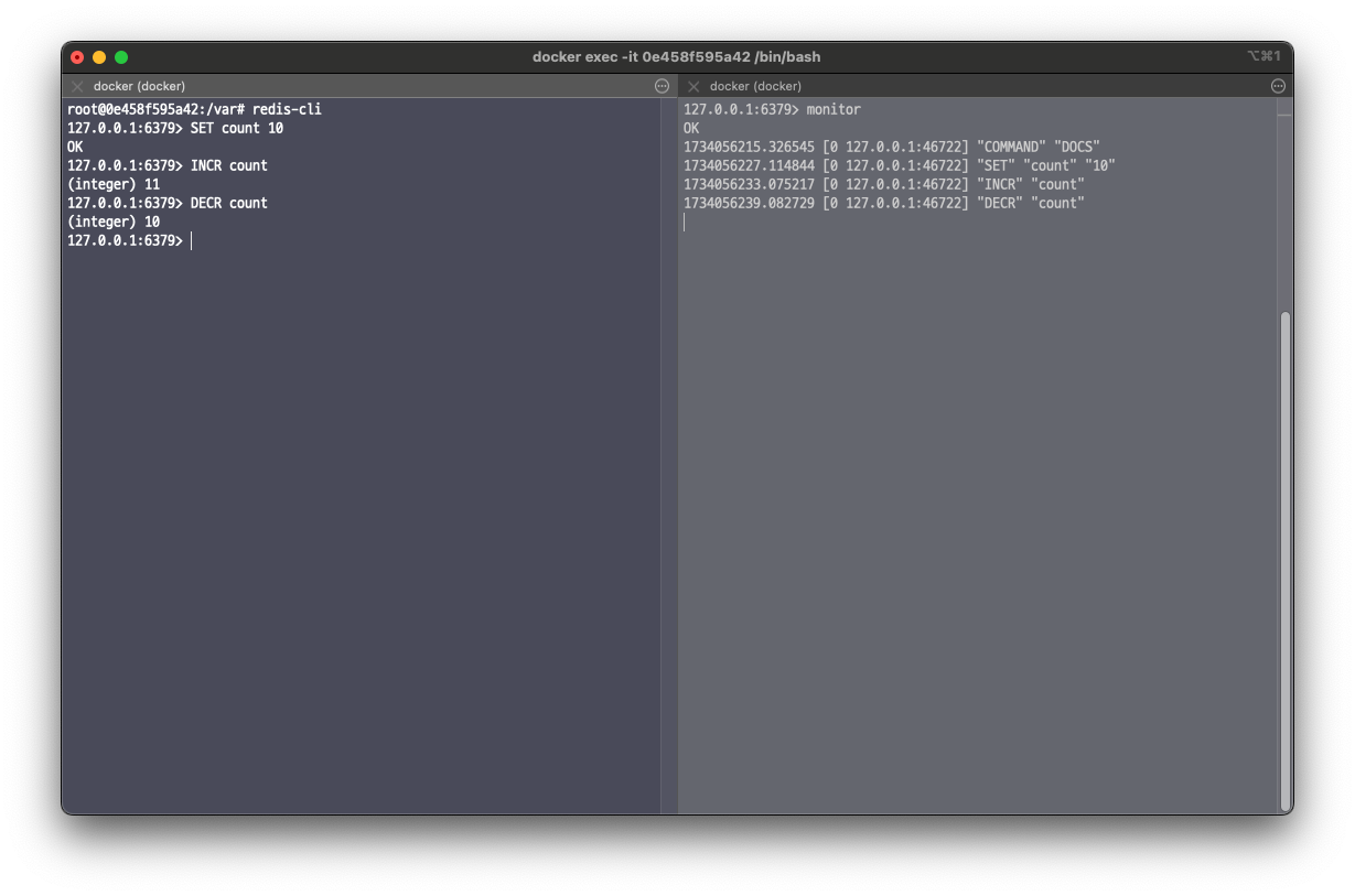 그리고 터미널을 분할하면 위와 같이 모니터링할 수 있는 쉘(오른쪽) 그리고 레디스를 테스트할 수 있는 쉘(왼쪽)이 있다. 이 정도의 세팅이 끝났다면 간단하게 레디스 명령어를 통해서 사용하는 방법을 알아보자.