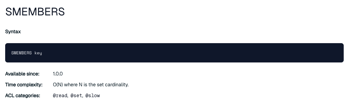 Redis에서는 문자열뿐만 아니라 List, Set, Hash 등의 자료구조를 지원한다. 이러한 자료구조를 LLEN이나 LRANGE, SMEMBERS(특정 원소가 자료구조 안에 있는지 확인) 등의 명령어를 쓰는 경우에는 시간복잡도가 증가할 수 있기 때문에 유의해서 사용해야 한다.