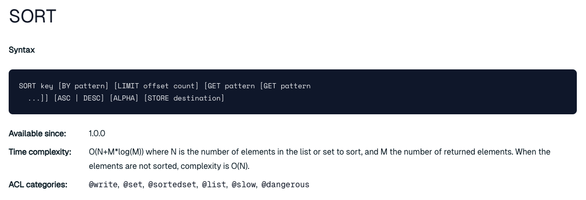 SORT 명령은 키에 대해서 정렬을 수행하는데, 정렬이기 때문에 O(N)의 시간복잡도가 나올 수 있다. 이러한 명령어는 유의해서 사용해야 한다.