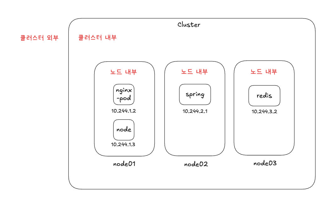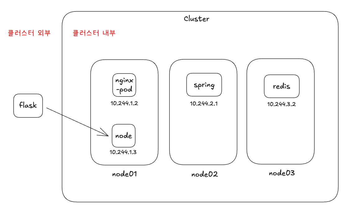 먼저 node01에 있는 nginx-pod을 생각해 보았을 때, 해당 노드 pod을 기점으로 다양한 부분에서 접근을 시도할 수도 있겠다. 같은 노드지만 Pod의 외부에 있는 node라는 pod도 있을 것이고, 다른 노드에 있는 spring이나 redis도 있을 것이다. 뿐만 아니라 cluster 외부에서도 접근을 생각해 볼 수 있을 것이다.