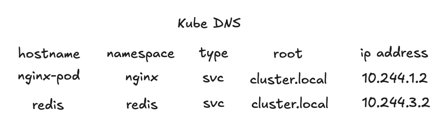 하지만 이러한 같은 네임스페이스, 같은 노드가 아닌 경우에는 보다 다양한 정보를 명시해 줘야 클러스터 내부의 다른 외부에서 찾아갈 수 있다. 아래와 같이 다양한 테이블이 생기게 되며, Pod의 위치에 따라 다르게 호스트명을 입력해서 접근할 수 있는 것이다.