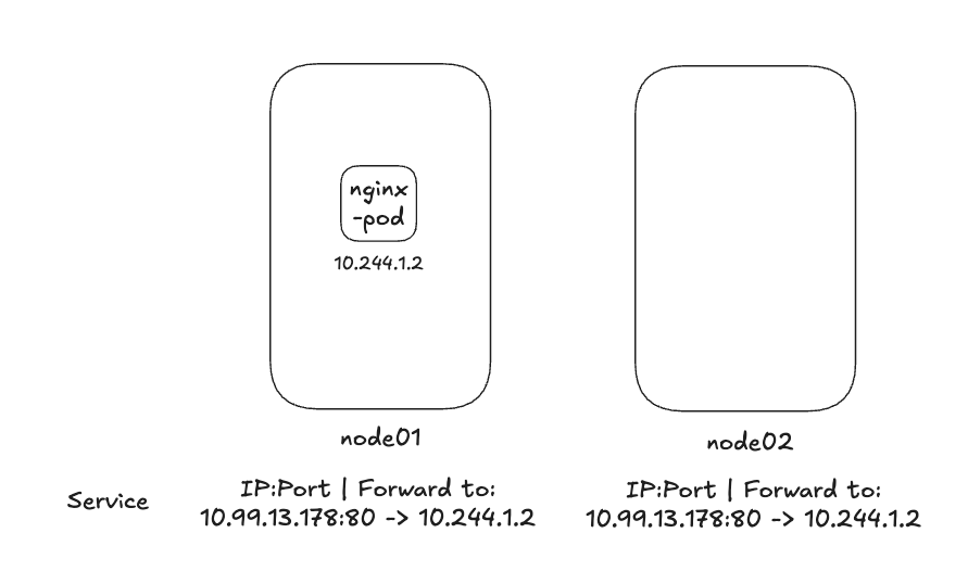 서비스 워크로드를 배포하게 되면, 위와 같이 각 노드에 라우팅 테이블이 만들어진다. 이를 통하여 모든 요청이 nginx-pod를 잘 찾아갈 수 있도록 트래픽을 제어한다. 다른 노드에 있는 Pod에서도 nginx-pod의 80번 포트에 접근하고자 할 때 접근할 수 있게 된다.