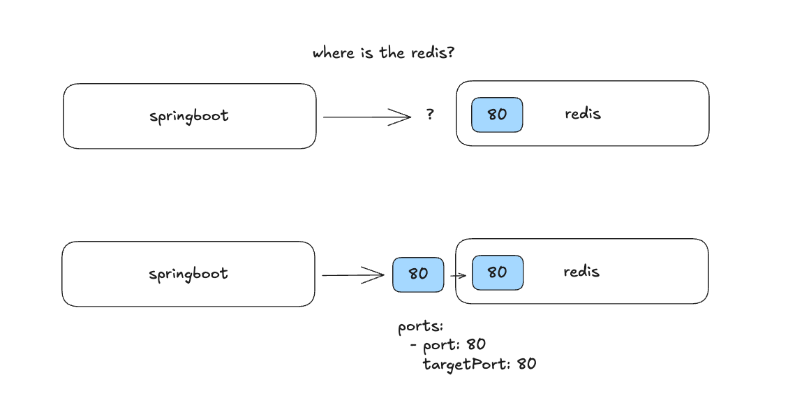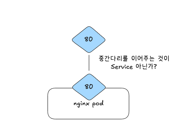 위와 같은 느낌이다. 이렇게 그저 80번 포트로 띄우면 내부에서만 알고 있다. docker에서 포트 바인딩을 해주듯이 Service를 통해서 port와 targerPort를 지정해줌으로써 외부에서 접근할 수 있게 해준다.