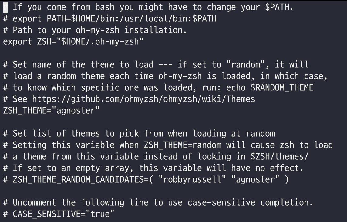 다음은 vi ~/.zshrc 명령어를 통해서. zshrc 파일을 확인한 것이다. 네 번째 라인을 보면 export ZSH="$HOME/.oh-my-zsh"라고 환경 변수가 명시되어 있는데, 다음과 같이 파일에 직접 export를 통해 환경 변수를 명시해 줄 수 있다.