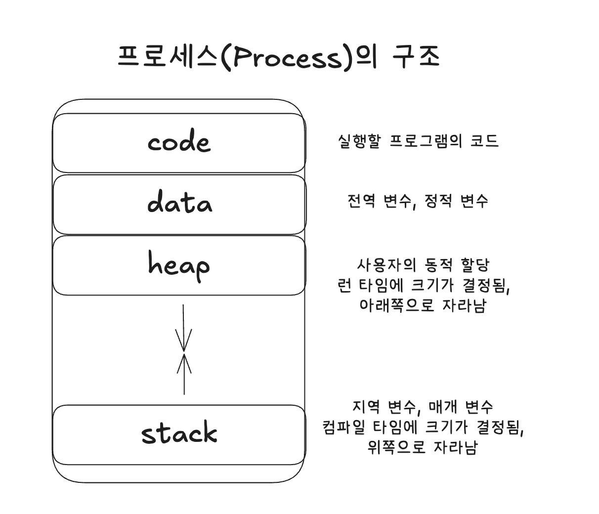 싱글스레드와 멀티스레드에서 대해서 이해하기 전에 다음의 프로세스의 구조에 대해서 알아야 한다. 프로세스는 네 가지의 영역으로 이루어져 있다. code, data, heap, stack의 구조로 이루어져 있고, 각각 다음과 같은 역할을 한다.