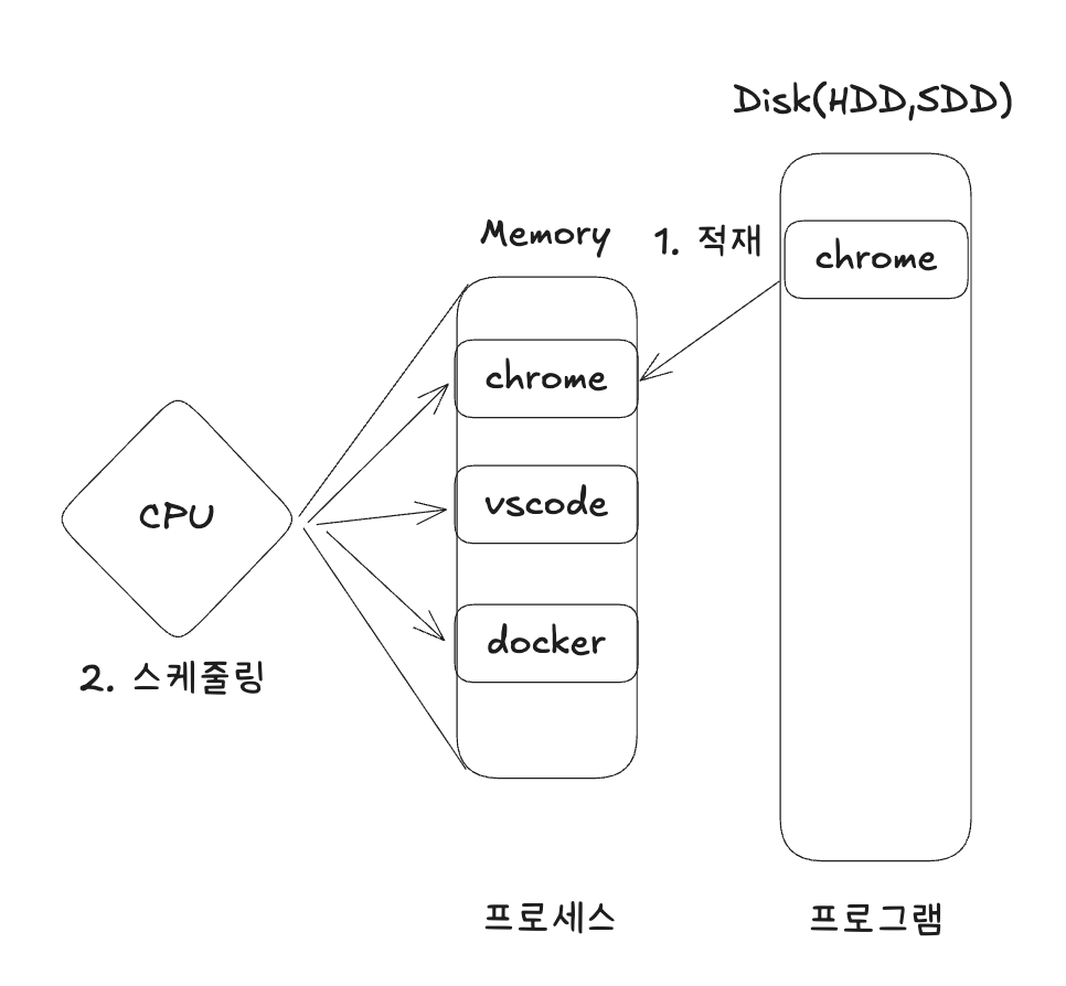 마지막으로 CPU는 메모리에 있는 다양한 프로세스들을 아주 빠르게 훑으며, 다양한 프로세스들이 동시에 돌아가는 것처럼 '보이게' 해준다. 위 예시는 docker와 vscode와 chrome을 동시에 실행시켜 프로세스로 만든 상태이고, 위 상황을 그려보면 세 프로그램이 전부 실행되고 있을 화면이 떠오른다. 하지만 동시에 실행되는 것이 아닌, 동시에 실행되는 것처럼 보인다.