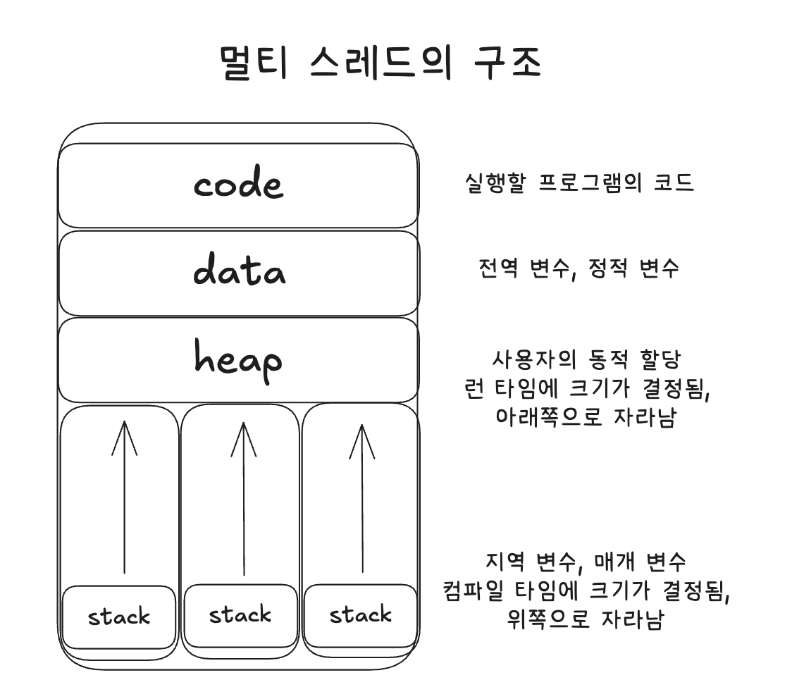 멀티스레드를 가장 큰 이점은 code, data, heap 영역을 스레드들이 함께 공유하기 때문에, 싱글스레드인 여러 프로세스를 실행해서 다양한 작업을 처리하는 것보다 멀티스레드를 사용하는 것이 오버헤드가 덜하다는 것이다.