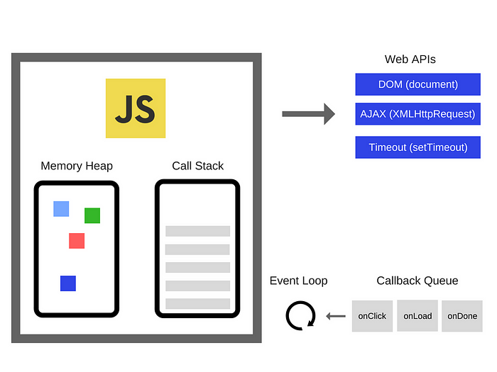 위 사진을 보면 자바스크립트의 외부에 다양한 것들이 존재한다. 대표적으로 Event Loop(이벤트 루프) 그리고 Callback Queue(콜백 큐)이다. 자바스크립트에서 실행된 모든 함수는 먼저 콜 스택으로 들어오게 된다. 그중에서 비동기 함수로 선언된 함수는 Web API를 호출하고, 콜백함수를 콜백 큐에 집어넣게 된다.