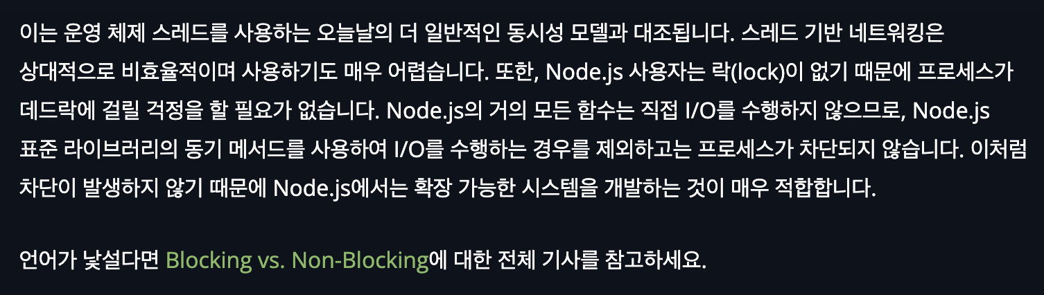 그 외에도 공식 문서를 읽어보면, 스레드가 없다는 내용으로 이야기가 전개되지만 반대로 이벤트 기반의 장점에 대해서 길게 설명이 되어있는 것들을 볼 수 있다. 아무래도 메인인 자바스크립트 자체가 싱글스레드기 때문에 어쩔 수 없는 부분인 것 같다.