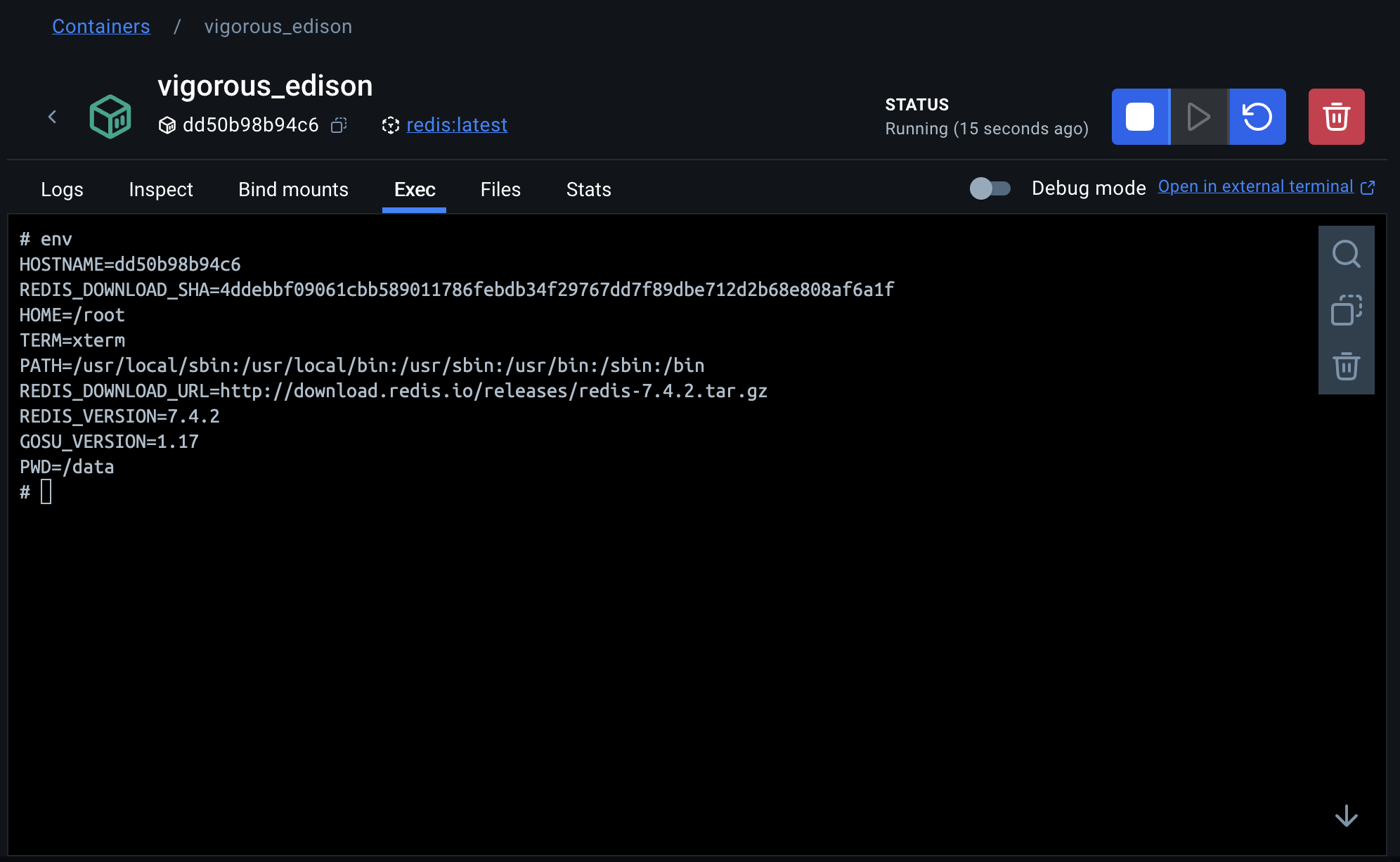 실제로 redis 7.4.2 버전의 dockerfile을 보면 위와 같이 ENV로 정의되어있는 것을 알 수 있다. 위처럼 정의된 ENV값이 그대로 레디스 컨테이너에 들어가게 된다. 여기까지 기본적인 dockerfile이 환경 변수를 처리하는 방법에 대한 것이다. ARG보다는 ENV를 쓰는 것이 거의 엔간한 상황에서 좋으며, ENV로 설정한 내용은 컨테이너를 실행시킨 후에 리눅스의 env 명령어로 확인할 수 있다.