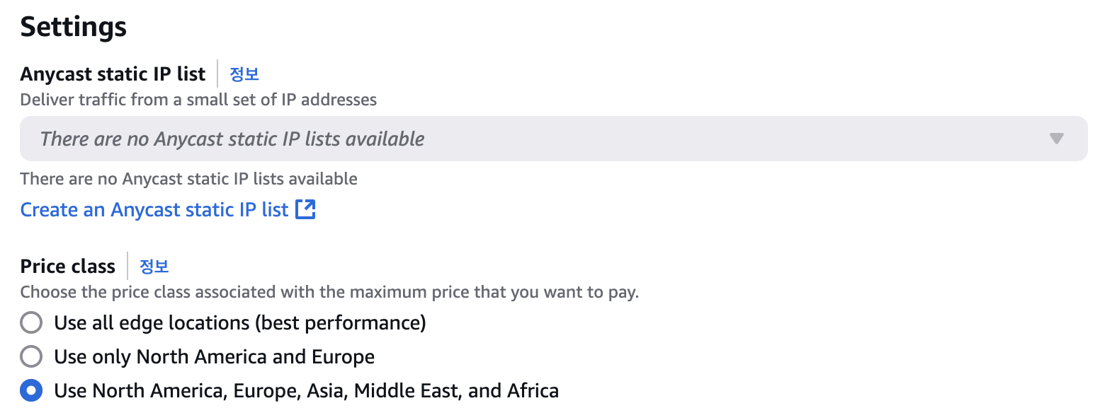이 외에도, Price class에 대해서 잘 모르는 사람들이 꽤 있는데, AWS는 전 세계에 216개의 Edge Location이 있다. 맨 위의 경우는 216개, 그리고 두 번째는 200개 마지막은 100개의 Edge Location만을 사용하게 된다. 만약, 글로벌 서비스가 아니라면 가장 낮은 클래스부터 시작하는 것도 나쁘지 않다. 어차피 Cloudfront의 Price class 설정을 나중에 바꿔줄 수 있기 때문이다.