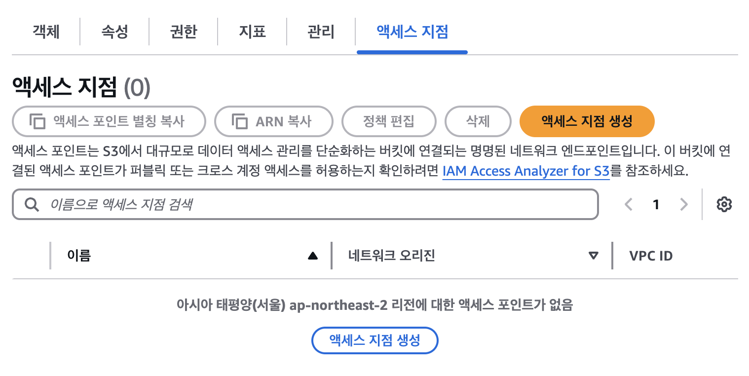 S3는 액세스 지점 생성을 통해서 VPC를 통해 데이터를 전달받도록 설정할 수 있다. 가끔씩 EC2 같은 리소스의 설정을 잘못하게 되면, S3에서 데이터를 가져오는 데, 인터넷을 거치는 등의 이슈가 발생할 수 있기 때문에, 꼭 체크하도록 하자.