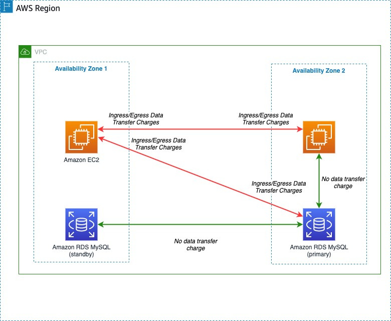 위 사진은 하나의 리전에서 두 AZ 간에 통신하는 부분을 나타낸 것이다. 중요한 포인트는 빨간색 화살표는 비용이 발생한다는 점이다. 여기서, RDS 간에 트래픽은 분명 AZ를 통과하는데, 초록색 화살표로 나타난 이유는 RDS의 Replication 기능을 사용하면, 추가적인 트래픽 비용이 나오지 않기 때문이다.