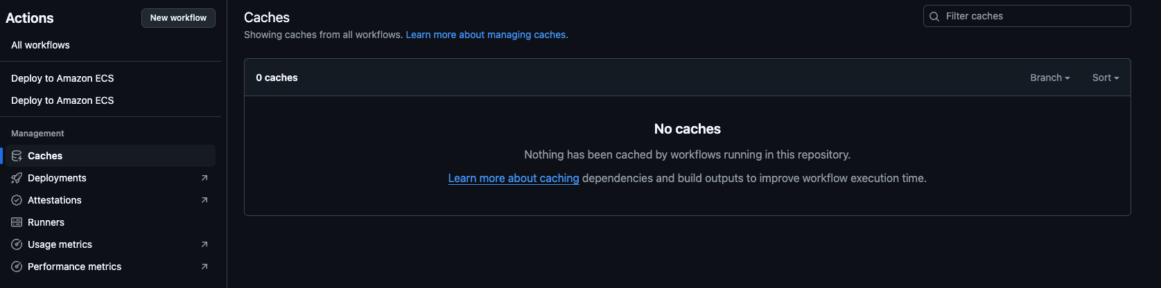 실제로 레포지토리에서 Actions -> Cache를 보면 깃허브 액션의 캐시를 살펴볼 수 있다.