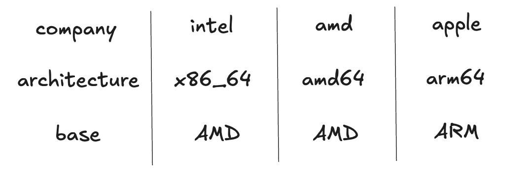그전에 앞서, ARM와 AMD 아키텍처를 먼저 짚고 넘어가야 할 것 같다. 우리가 흔히 아는 CPU는 아마 Intel일 것이다. 그리고 맥북을 좀 안다면 맥북에서 m1, m2와 같은 CPU를 내고 있다는 것도 알 것이다. CPU 회사들의 제품들 아키텍처는 다음과 같이 정리할 수 있다.