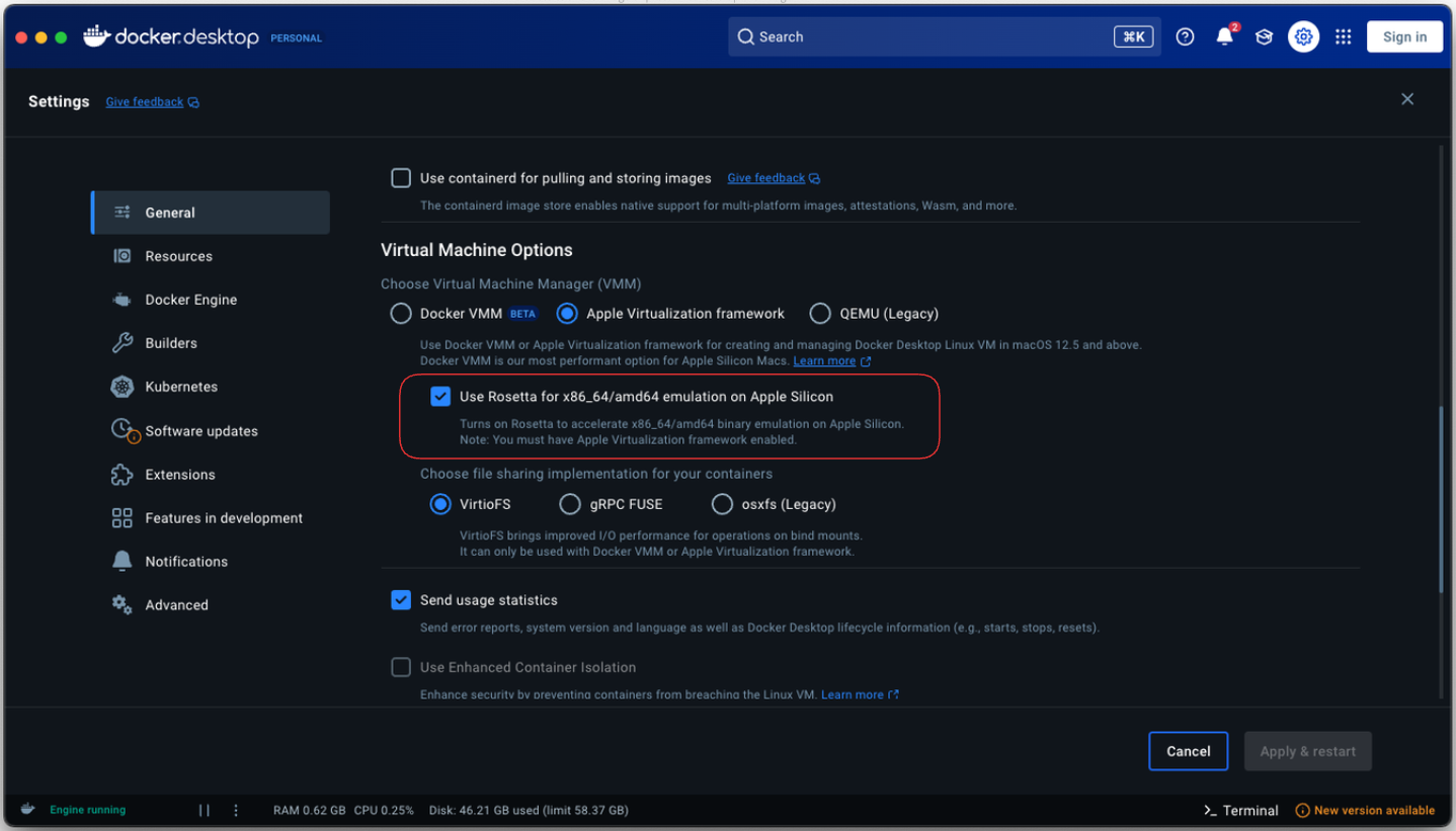 특히, ARM을 사용하는 경우에는 로제타라는 에뮬레이터를 통해서 x86_64/amd64 아키텍처를 사용할 수 있도록 할 수 있다. 물론 에뮬레이팅의 오버헤드로 인해 성능은 떨어지겠지만, 나쁘지 않다. 로제타가 맥에 설치되어있지 않는 경우에는 이 버튼 활성화가 안되며 로제타를 설치하는 이야기를 한다.