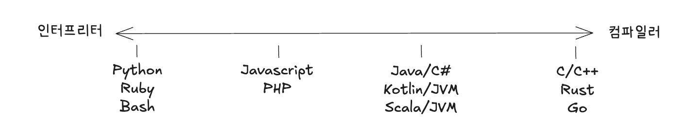 이렇게 이야기를 꺼내는 이유는 컴파일러 언어, 인터프리터 언어 이렇게 이분법적으로 정의하지 않고, 컴파일과 인터프리팅을 스펙트럼으로 생각하면, Java의 위치와 인터프리터 언어들이 꾸준히 발전하면서 점점 컴파일러 언어와 닮아가려고 하는 것을 이해할 수 있다.
