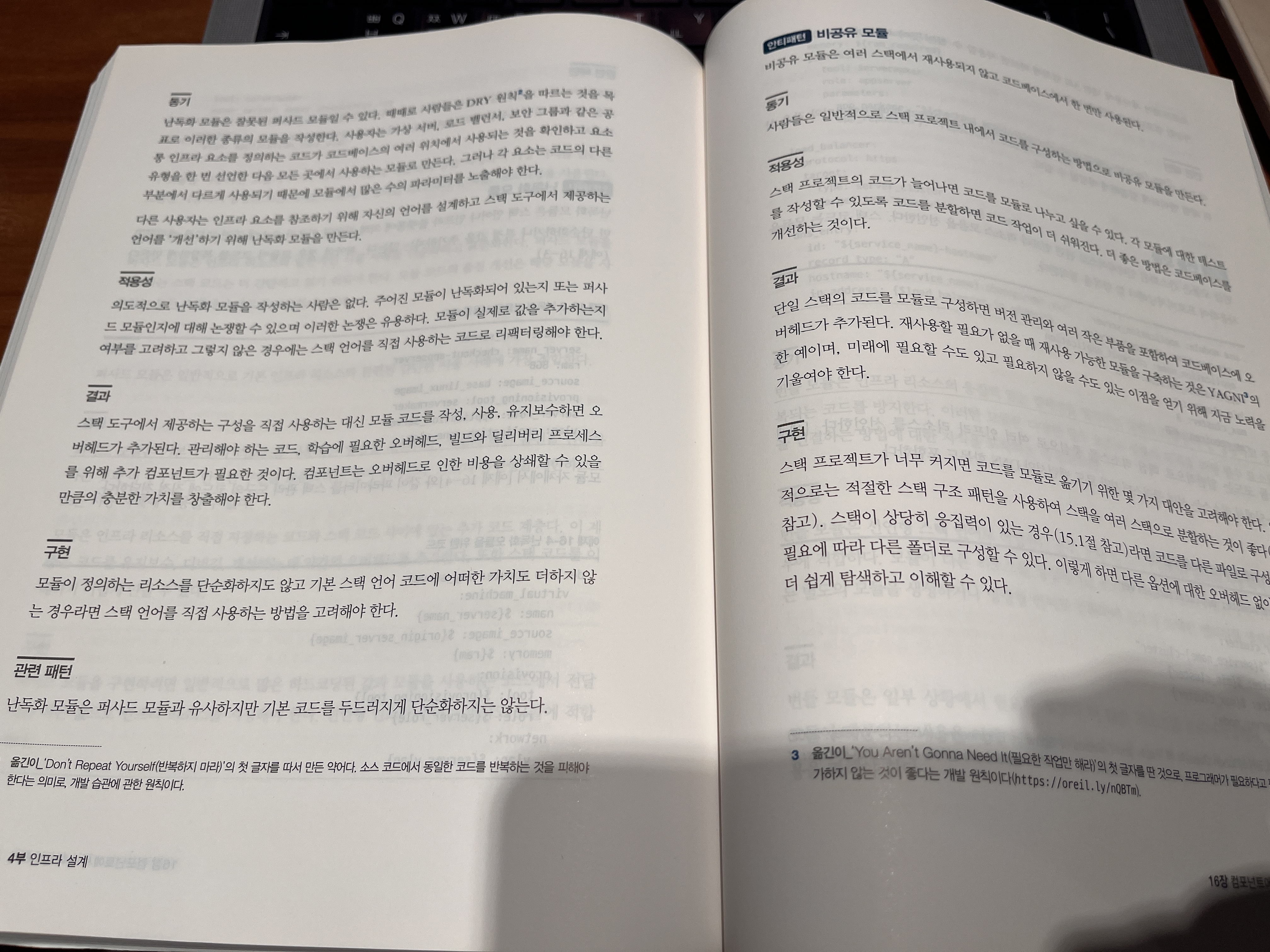 이 책은 특정 패턴에 대해서, 왜 그렇게 사람들이 행동(혹은 선택)했는지 설명하는 동기를 설명한다. 위 예시는 안티패턴인 난독화 모듈 방법에 대해서 이야기한다. ( 여기서 모듈은 우리가 흔히 아는 Terraform에서 말하는 인프라 스택 단위이다 )