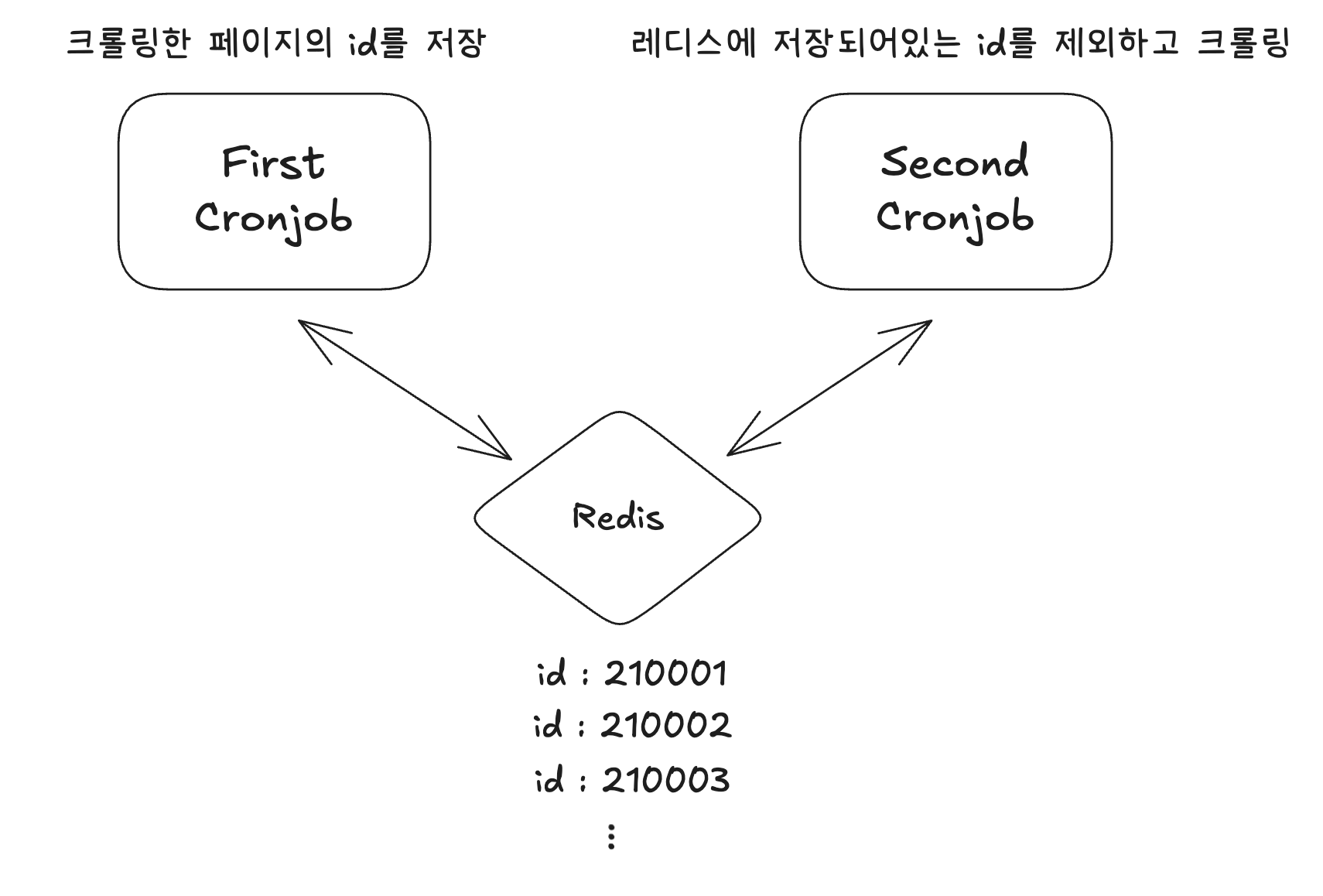 이러한 stateless한 상태를 stateful하게 만들기 위해서는 레디스와 같은 key-value 스토어가 필요했습니다. 스토어에 어디서부터 어디까지 크롤링했는지를 넣어두고, 다음에 새롭게 뜨는 크론잡이 레디스를 참조하여 어디서부터 어디까지 크롤링이 되었는지를 확인하여, 자신이 크롤링해야하는 범위를 확인하고 작업 후에 다시 레디스에 저장하는 방식을 통해서 '서버에서 상태를 저장하여' stateful하게 문제를 해결할 수 있었습니다.